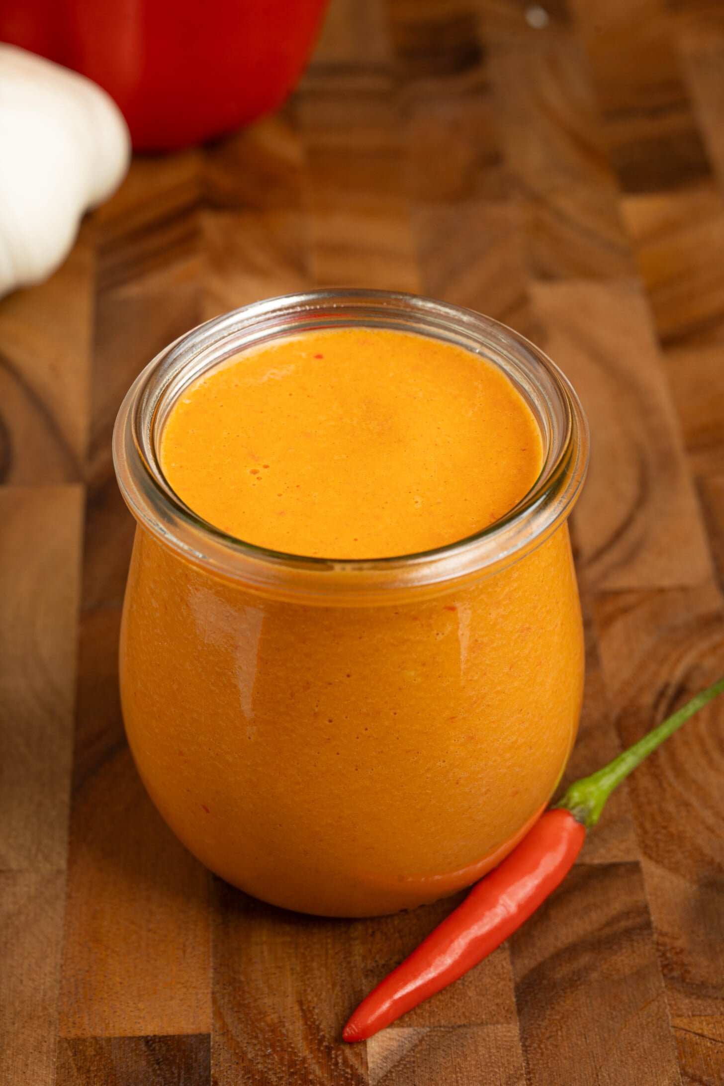Adding a splash of water encourages the creamy, emulsified texture of this red pepper sauce. The result is a super light, silky smooth mojo rojo.